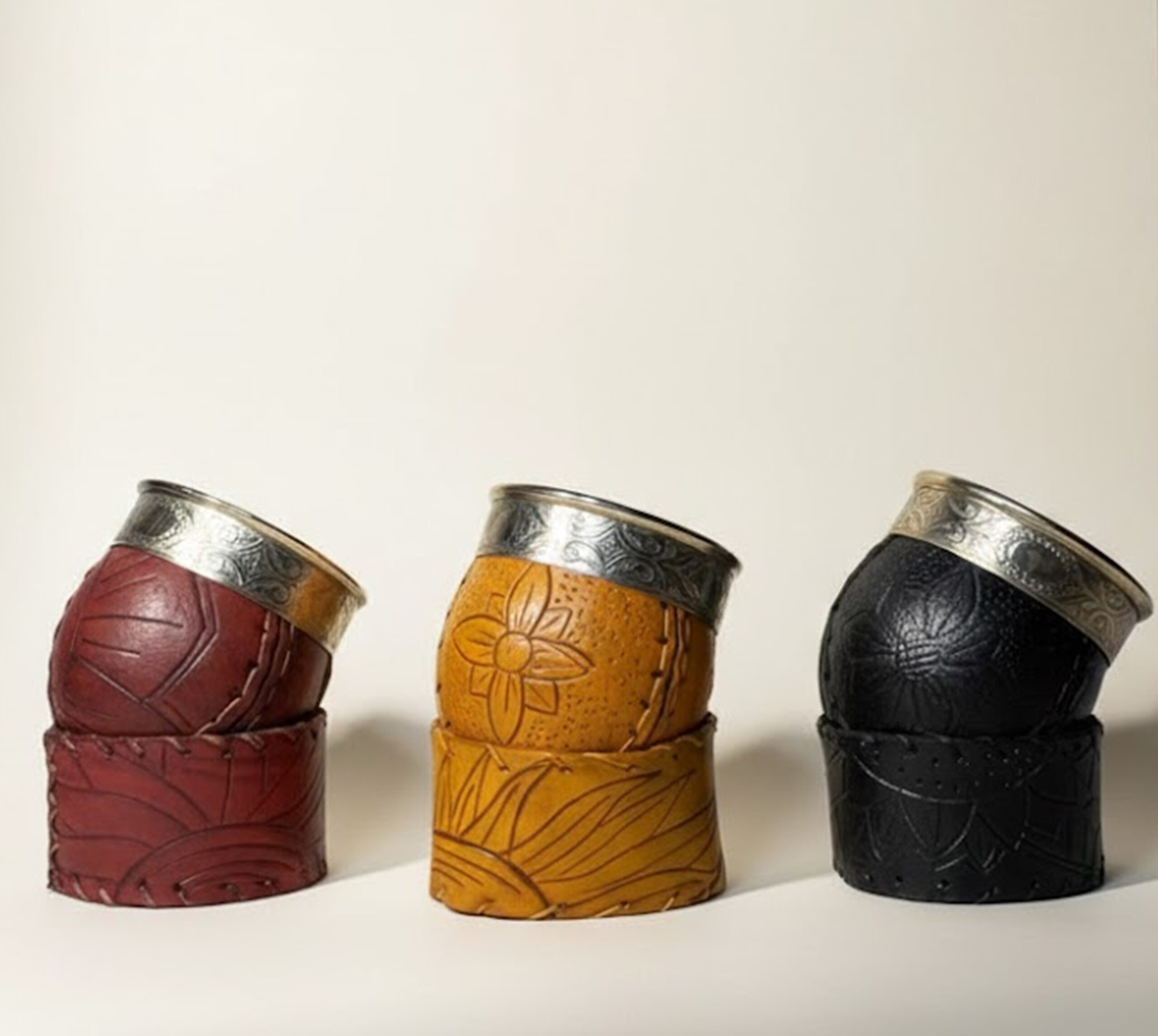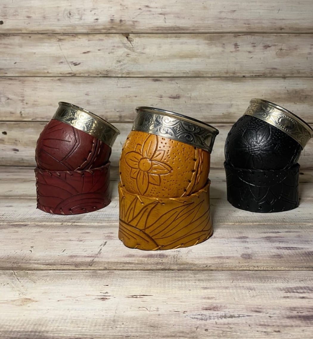 Cada mate está trabajado a mano: cuero grabado, puntadas visibles, metal labrado y una presencia que pesa.
